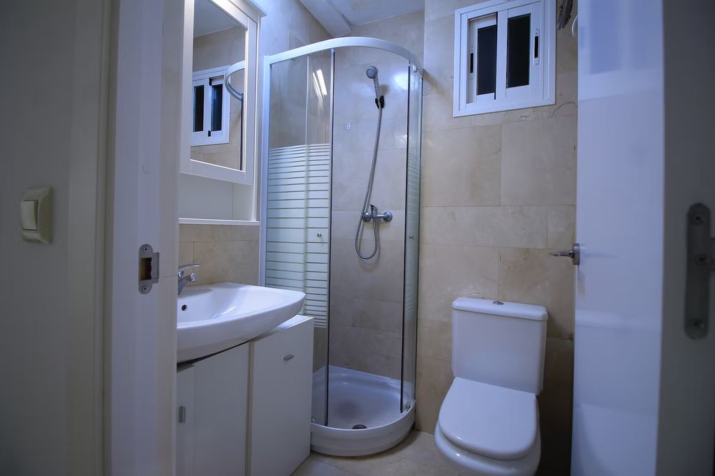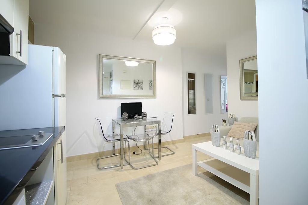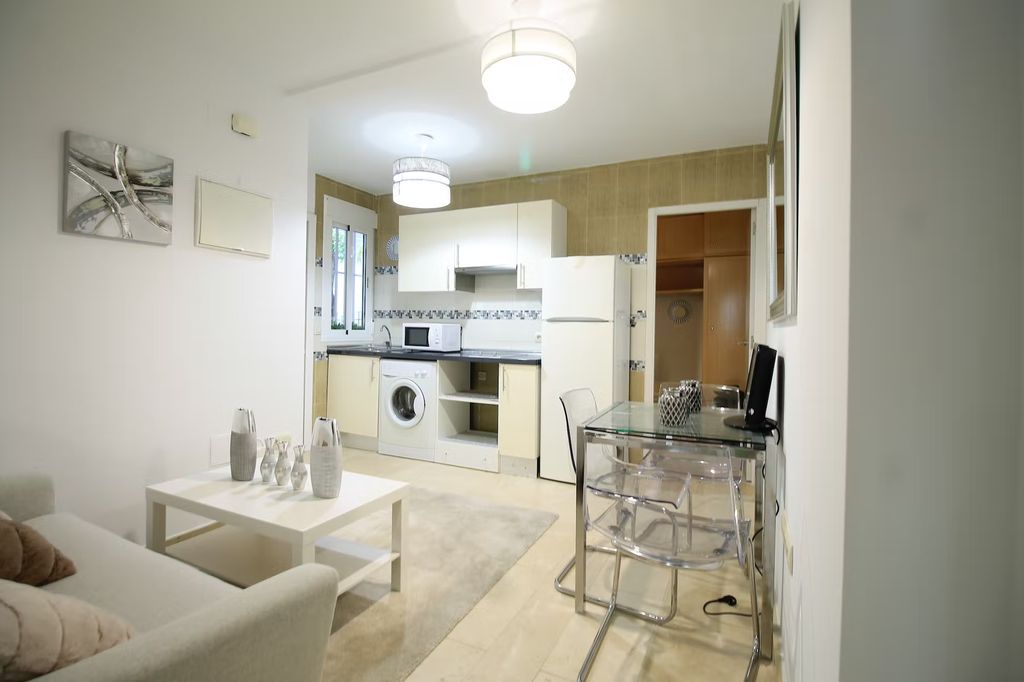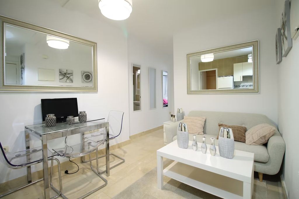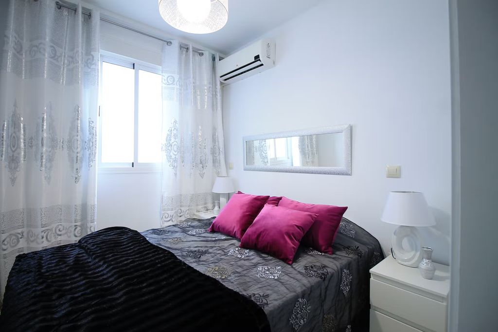 Great 50m2 furnished flat totally refurbished in 2022 with two large bedrooms, one with air conditioning. Ideal to share for two or more people because the bedrooms are both a good size, have large built in wardrobes and bedside tables. Spacious living / dining room with kitchenette, sofa bed and table with four chairs. The kitchenette is fully equipped with a large fridge, washing machine, two burner glass hob and microwave. It has a modern bathroom with shower, washbasin and toilet.